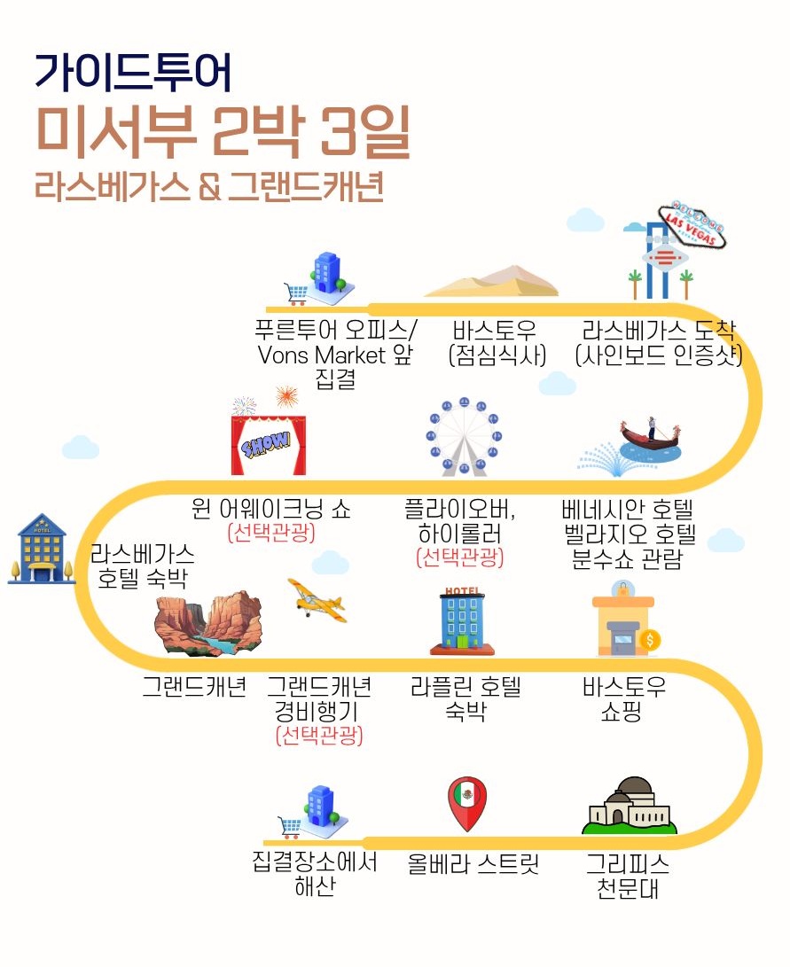 ⚠️ 라스베가스 국제 컨퍼런스 또는 컨밴션 & 미국연휴 기간에는 메인스트립 외곽지역으로 호텔이 변경되거나 라플린과 라스베가스 일정 순서가 변경 될 수 있습니다.