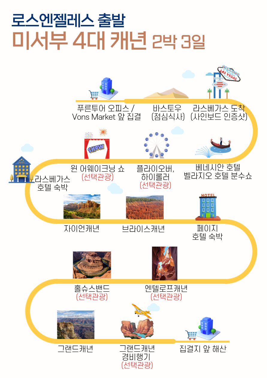 ⚠️ 라스베가스 국제 컨퍼런스 또는 컨밴션 & 미국연휴 기간에는 메인스트립 외곽지역으로 호텔이 변경되거나 라플린과 라스베가스 일정 순서가 변경 될 수 있습니다.